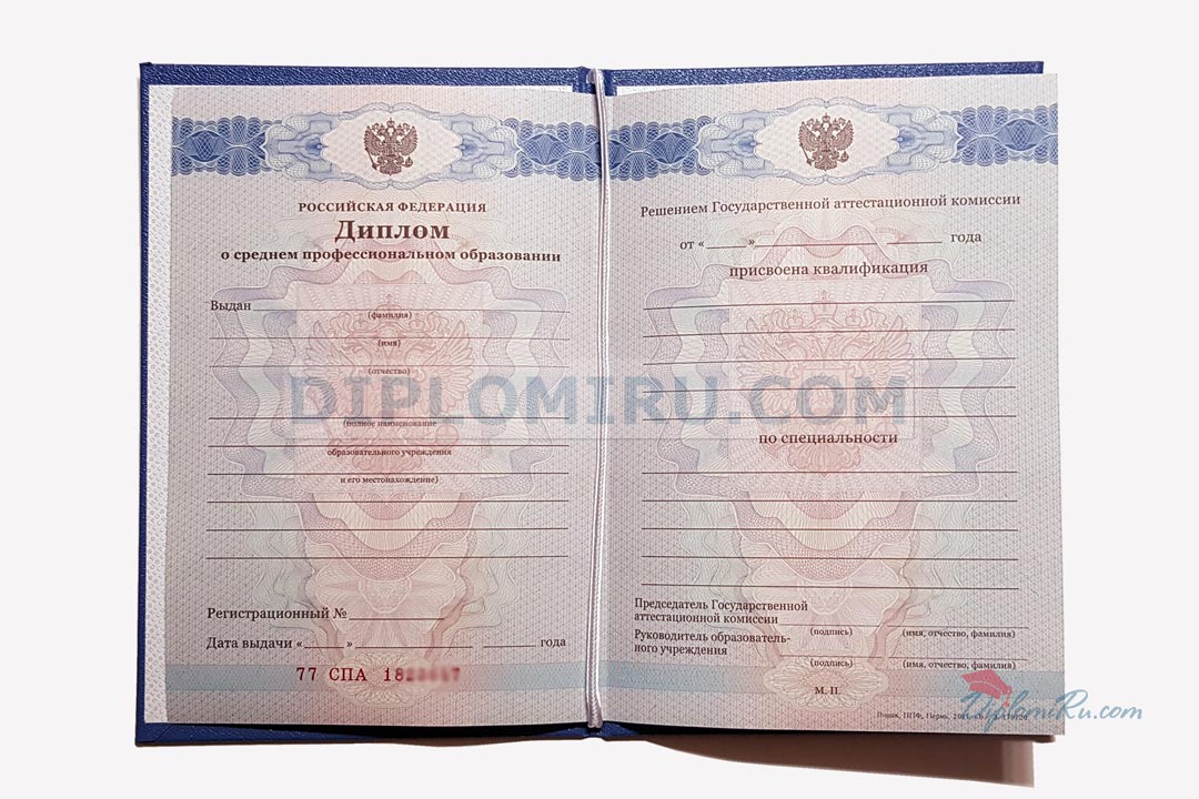 Диплом об окончании указанного ССУЗа в 2011-2013 годах. Бланк «Гознак»